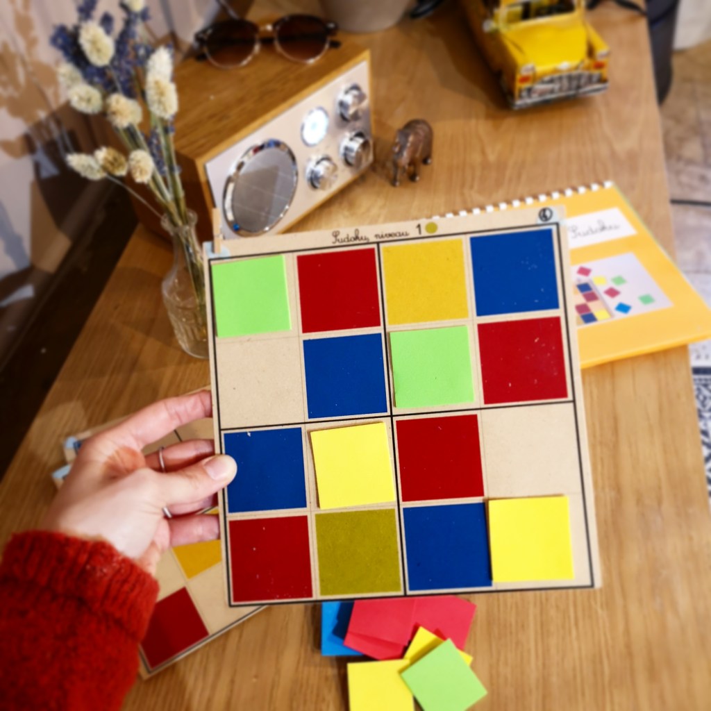 - Niveau 1 : 4 planches pour se familiariser avec la logique. Chaque ligne de 4 cases, et chaque carré de 4 cases doivent comporter les 4 couleurs (vert, jaune, rouge, bleu). Astuce pour les enfants : commencer par les carrés ou les lignes dont une seule couleur est manquante afin de débloquer les autres lignes.