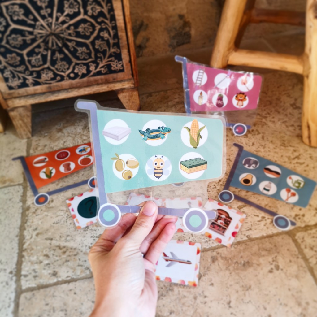 Le déroulement du jeu est très simple : un enfant pioche une carte (ou tire le dé), prononce le mot illustré et essaie de trouver un mot qui commence par la même syllabe dans son caddie. S’il en trouve un, il le recouvre d’un jeton.
