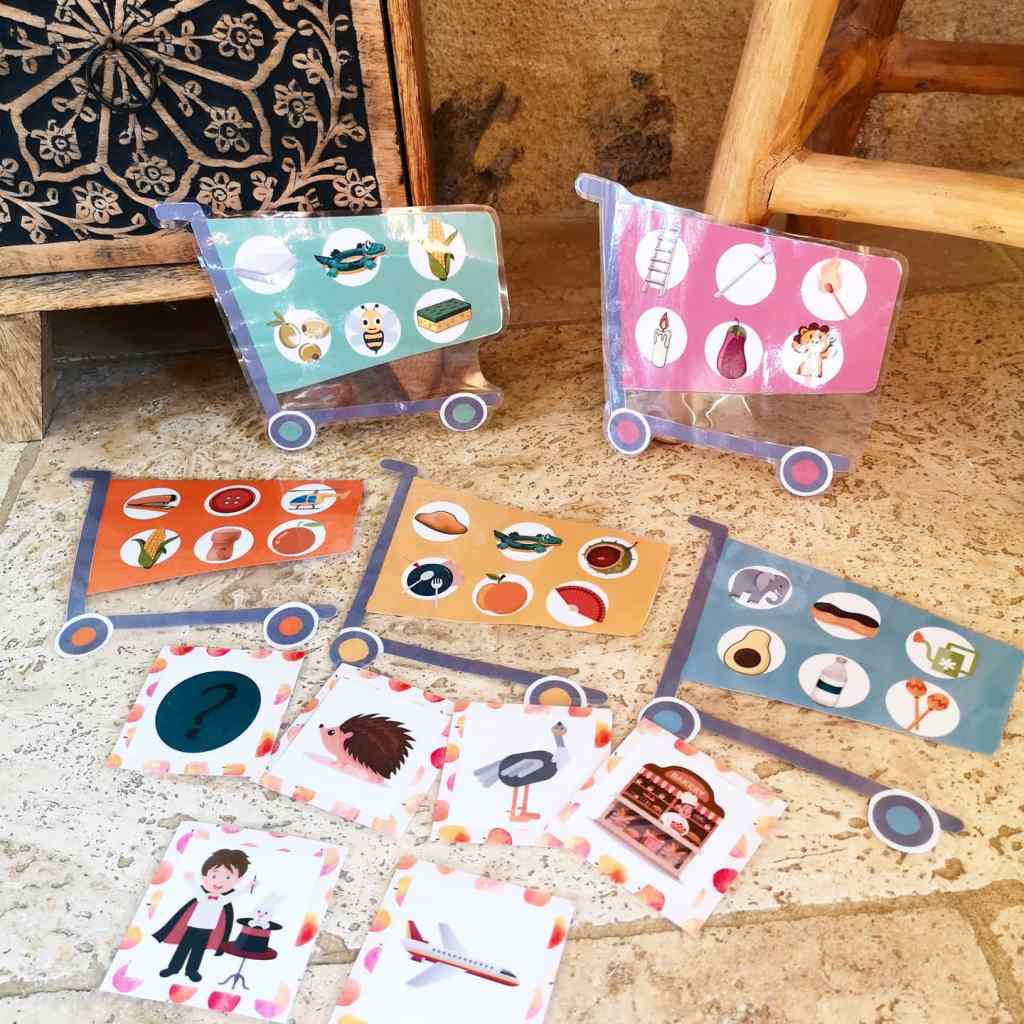 Comme je l’expliquais sur Instagram, en phonologie, j’utilise la méthode très bien pensée « Vers la phono » des éditions Accès. Le manuel propose tout le matériel nécessaire, mais parfois il m’arrive d’avoir envie de créer une nouvelle version (plus colorée) du matériel afin de donner davantage envie aux enfants de jouer (avec moi, puis de façon autonome). De plus, la version Accès propose « seulement » 4 caddies, donc 4 joueurs, alors qu’il m’en fallait 5 !