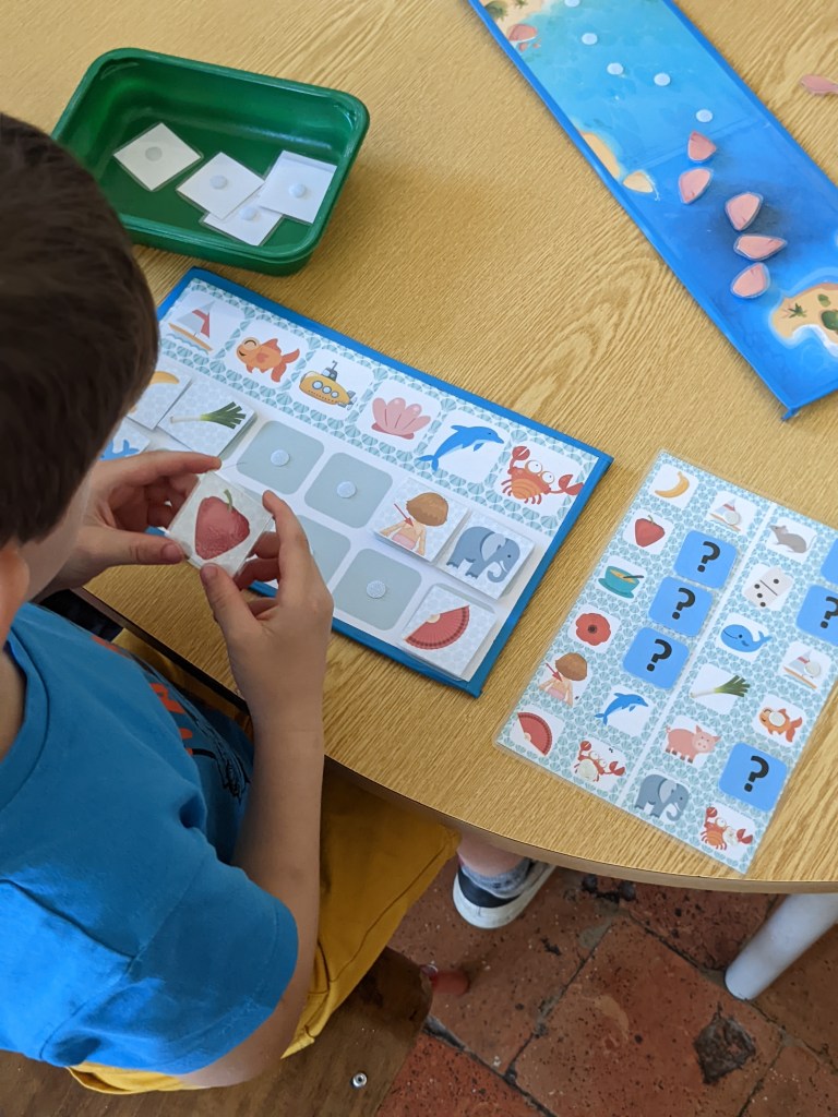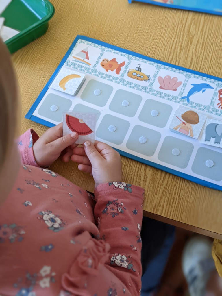 Pour ma part, j’ai collé de petits ronds de velcro à l’arrière de tous les rochers, de toutes les cartes mot-image, ainsi que sur le tableau des syllabes et sur le plateau de jeu (à répartir de façon à pouvoir poser 10 pierres).