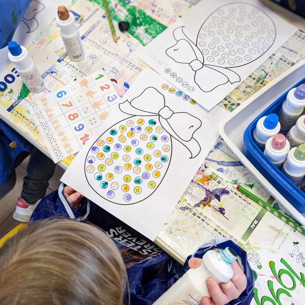Mes élèves utilisent les « chunkies » (encre en tube, embout rond) pour ajouter la couleur demandée à leur production. Ils terminent en coloriant l’œuf au crayon de couleur mais je n’ai pas encore de photo des résultats finaux.