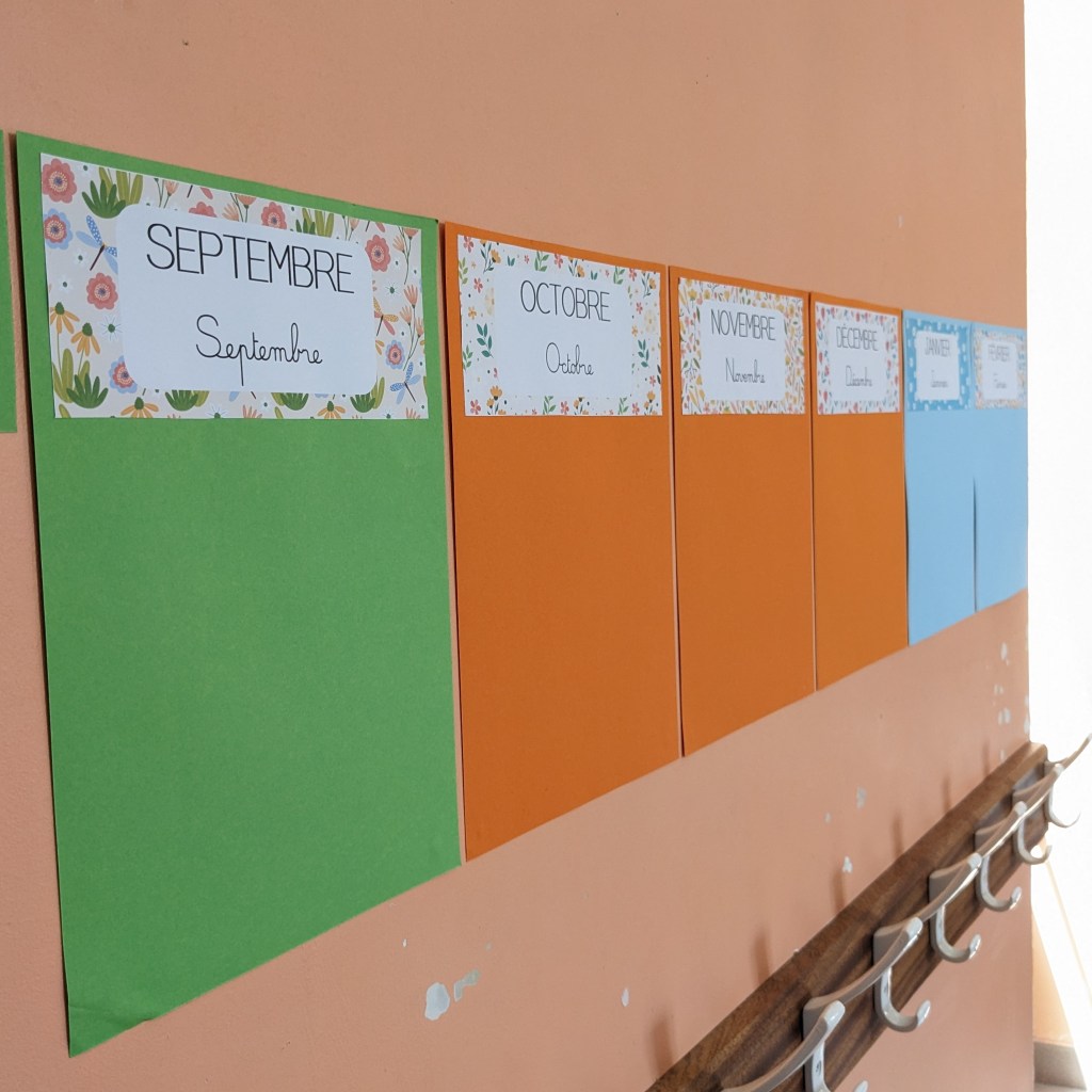 Ces petites affiches serviront de calendrier annuel : avec les enfants, nous collerons régulièrement les photos des événements de chaque mois (anniversaires, sorties, projets, …). J’ajouterai une flèche rouge qui indiquera le mois en cours.