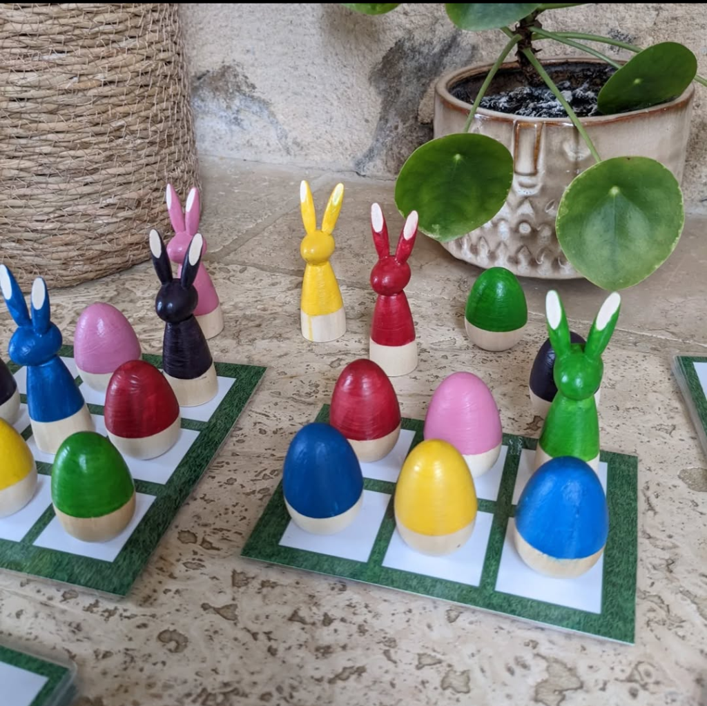 Pour le réaliser j’ai colorié les éléments en bois à l’aide de feutres poscas (rose, rouge, bleu, violet, jaune et vert). Je les ai ensuite vernis. Les lapins sont en un seul exemplaire, alors qu’il y a deux oeufs par couleur.