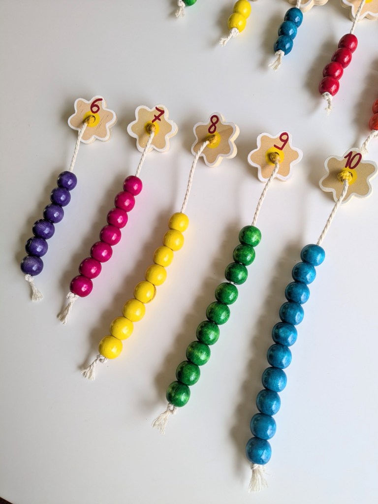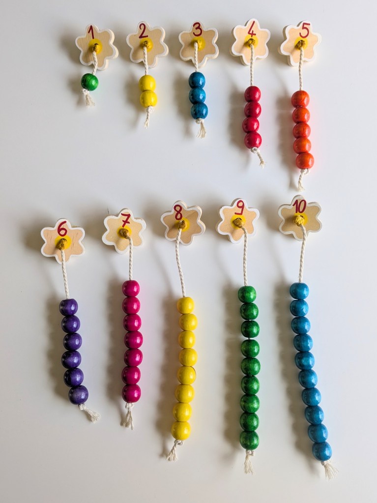 L’enfant doit associer la fleur au bon nombre de perles en glissant le bout du fil à l’intérieur du trou. J’ai rigidifié l’extrémité de la ficelle en la trempant dans du vernis-colle afin que l’enfant ne rencontre pas l’obstacle de la motricité fine (enfiler dans le trou).