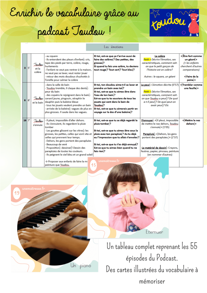 – un tableau de 20 pages regroupant les 55 épisodes du podcast. Il contient les grandes lignes de chaque épisodes, les questions posées au cours de l’épisode (qui ouvrent sur des discussions collectives), les mots de vocabulaire sur lesquels il peut être intéressant d’attirer l’attention des enfants, les expressions utilisées dans l’épisode.