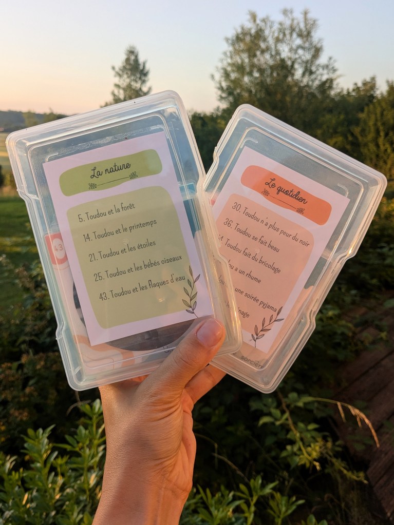 Je vous partage également (et gratuitement cette fois) les étiquettes de rangement des cartes de vocabulaire pour les 55 premiers épisodes. Elles sont ajustées à la taille de ces boîtes-ci. Vous trouverez le fichier juste en dessous :