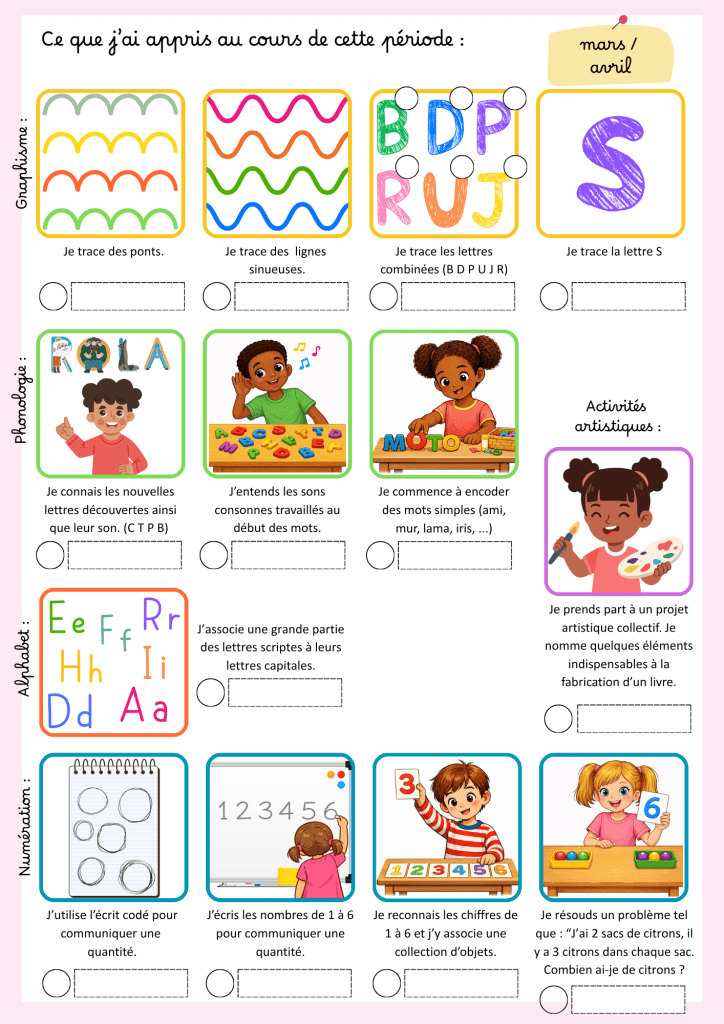 Je les utilise pour illustrer les compétences travaillées avec mes élèves : elles me servent au quotidien pour indiquer aux enfants ce que nous allons travailler durant l’atelier, mais aussi en fin de période pour évaluer les enfants et présenter aux familles l’essentiel des compétences travaillées. Je vous glisse ci-contre un aperçu de cette fiche que j’utilise depuis la période 3 seulement (c’est tout frais !).